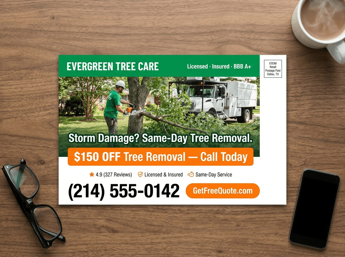 After a storm, homeowners WANT your postcard. For seasonal services (tree trimming, gutter cleaning, mulch), mail hitting the week intent peaks converts at 2-3x email.