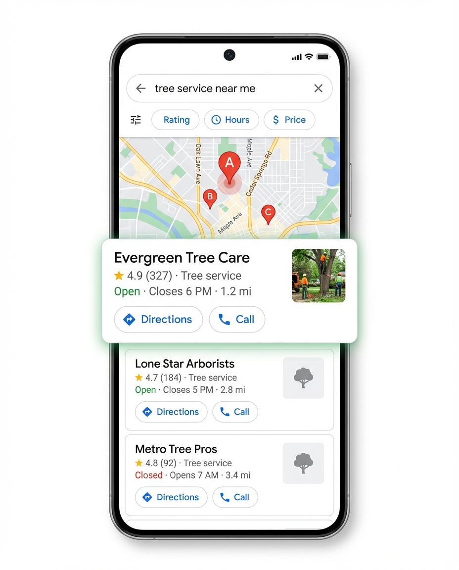When a homeowner searches “tree service near me”, Google shows the Map Pack before anything else. The top three businesses capture roughly 80% of the resulting calls. We get you there — and keep you there.
